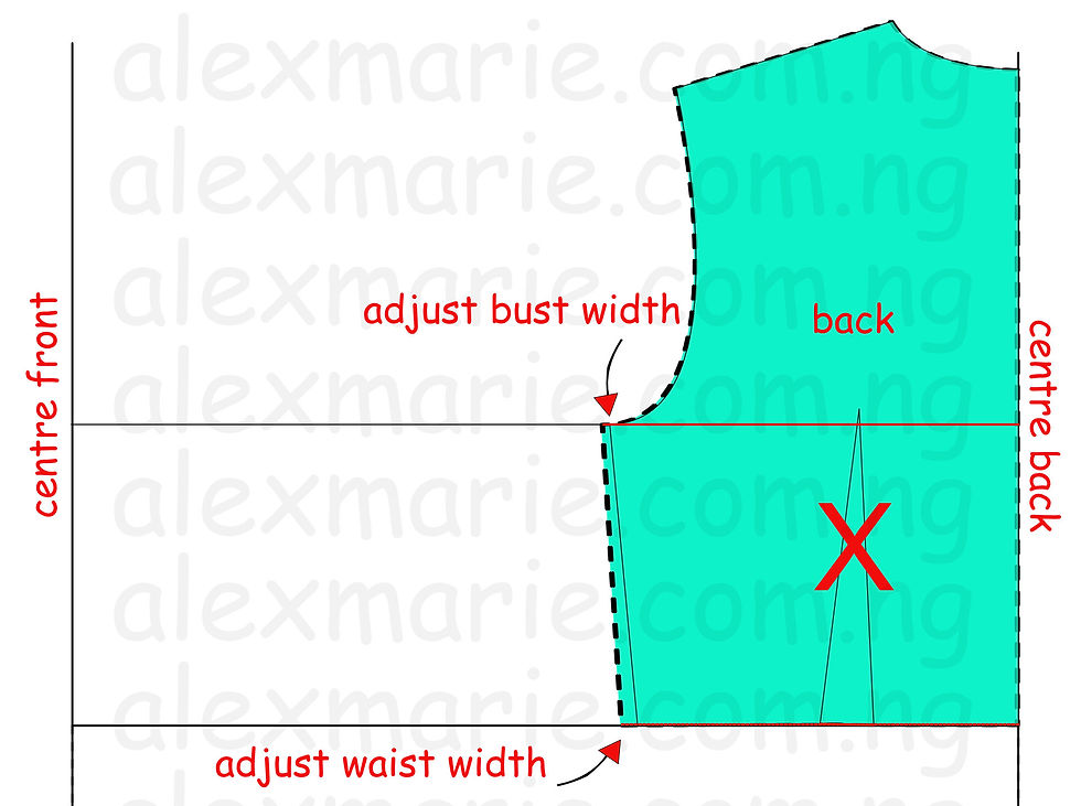 1) Add 3/8inch (1cm) to the centre front length, square out and blend to the waist.